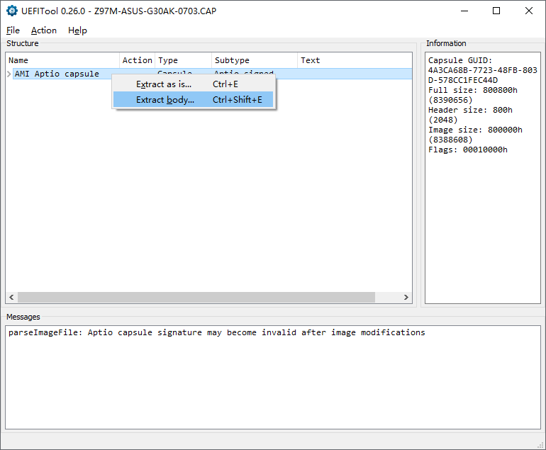 遇到这种情况说明修改时没有使用备份 BIOS,而是使用官方 BIOS 文件(.CAP 文件)。要解决这个问题需要对 CAP 进行脱壳处理。